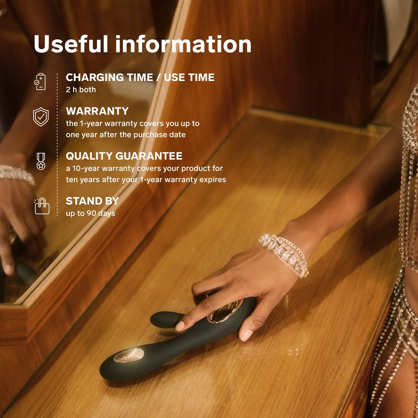 SORAYA Wave™ comes with both a 2-year LELO warranty and a 10-year quality guarantee for peace of mind and long-lasting quality. To keep your device clean, use LELO Premium Cleaning Spray.