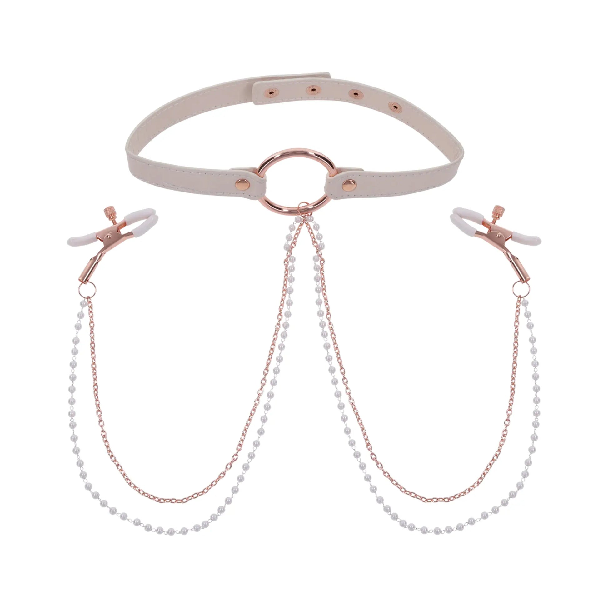 Sweet, sophisticated and a tad mischievous, the Peaches ‘N CreaMe Collar combines faux fur luxury with adjustable rose gold nipple clamps for a playful twist on power play. Soft and plush against your skin, the collar hugs perfectly while the rose gold hardware and pearl chain add a touch of elegance to every tug and tease. Take control with the detachable leash or let your partner lead.